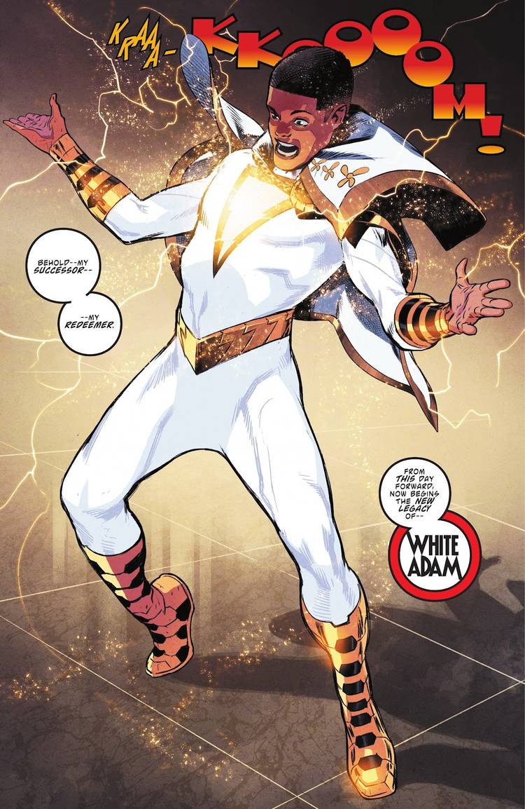 Teth-Adam chooses his descendant Malik White as a successor to assume control of his lightning powers and guide Khandaq to a bright future, giving him the name White Adam as a symbol of this responsibility.