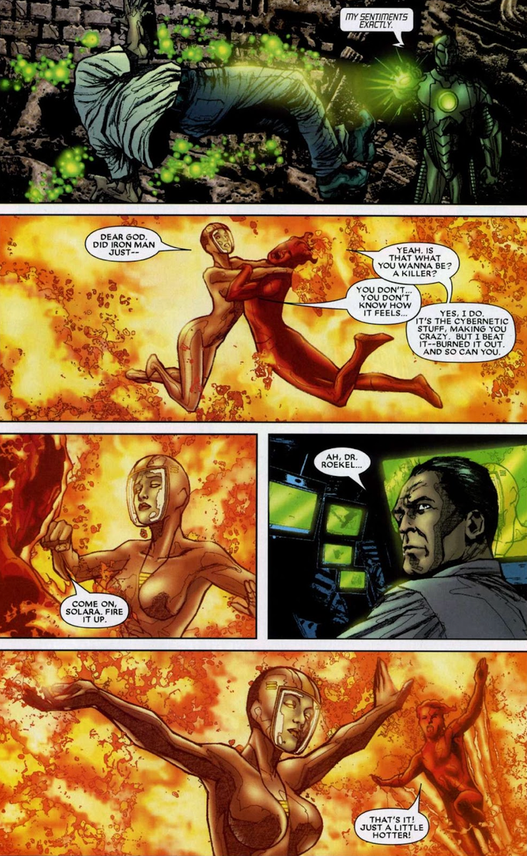 Stark's suits, rather than help him, actually exacerbate the problem. In Marvel Nemesis: The Imperfects #5, written by Greg Pak with art by Renato Ariem, an alien cybernetic serum has infected Storm, Wolverine, Iron Man and the other heroes, making them feel superior. According to Storm, "It made us feel...perfect. You have no idea." The serum eventually infects Iron Man, turning his suit a sickly green color - and manipulates him into blasting Wolverine across a clearing. Logan's healing factor allows him to survive, but the blast would most likely have killed anyone else.