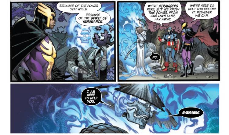 Avengers #58 (by Jason Aaron, Javier Garron, David Curiel and VC's Cory Petit) finds the eponymous team separated in the middle of feudal Japan before being beset on all sides by time-displaced minions of Mephisto. Before Captain America and the Avengers' most recent addition Nighthawk can come to any harm, this era's Ghost Rider, or rather Ghost Ronin, emerges to cut down their assailants. His presence is short-lived on that particular battlefield, as he quickly dissipates before appearing to stop the Viking ship headed straight for Namor and Echo. After yet another gruesome disappearing act, the Samurai of Vengeance has finally cleared the way for the Avengers to reassemble so he can point them in the right direction.