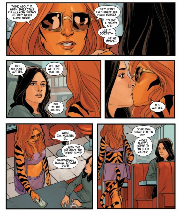 Tigra theorizes this out loud over coffee in the opening pages of The Variants #2 by Gail Simone and Phil Noto where she tells Jessica Jones that for some unexplainable reason, Hell's Kitchen always seems to be, as she puts it, "safe" from attacks from Marvel's biggest antagonists like Thanos, Ultron, and Dormammu. "Who's gonna hurt you, the damn Stilt-Man?" Tigra adds that she can't explain it, but there's "something concealed" about Hell's Kitchen that makes it immune to bigger threats.