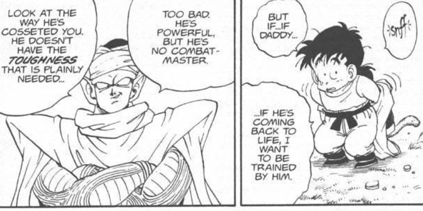 In Dragon Ball chapter 206 by Akira Toriyama, Piccolo is training Gohan following the death of Goku during his battle with Raditz. Piccolo is only taking such a drastic measure in teaching someone as young as Gohan the ways of martial arts because Raditz told him and the others that they only have one year before Vegeta and Nappa get to Earth, and they needed all the help they could get. When Gohan throws a fit telling Piccolo that he would rather have his father train him, Piccolo replies, “He’s powerful, but he’s no combat-master,” Piccolo then elaborates further, “He doesn’t have the toughness that is plainly needed…” which was a comment on both Goku’s lack of teaching ability and Gohan’s lack of discipline.